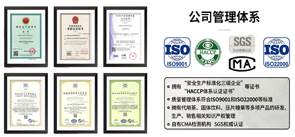 10W級(jí)GMP凈化車間,擁有CMA中國(guó)計(jì)量認(rèn)證實(shí)驗(yàn)室,有第三方檢測(cè)資質(zhì)嚴(yán)格的質(zhì)量管理體系:ISO質(zhì)量管理體系/HACCP體系認(rèn)證